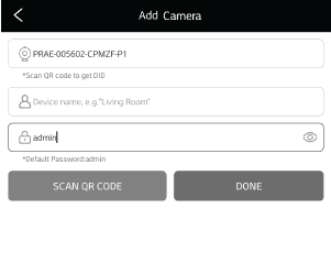 Click the “+” button on the top right to add camera. Device name is optional.